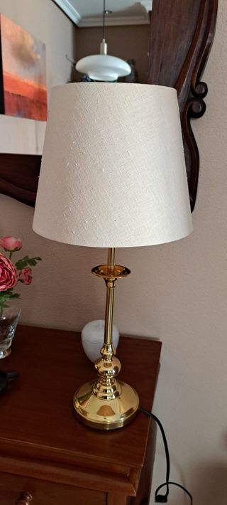 Lámpara de sobremesa elegante de latón dorado, en muy buen estado. Diseño clásico ideal para salón, dormitorio o recibidor. ✔ Funciona perfectamente ✔ Incluye bombilla ✔ Pantalla de tela limpia y cuidada Medidas: • Altura total: 73 cm • Pantalla: 20 cm diámetro superior / 40 cm diámetro inferior Da una luz cálida y decorativa, muy vistosa una vez encendida.