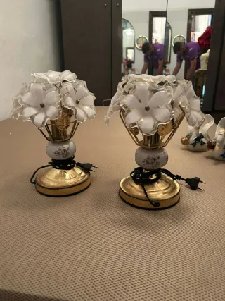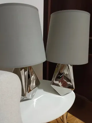 Se venden dos lámparas de mesa con un diseño moderno y elegante. Son perfectas para añadir un toque de luz a cualquier habitación. - Base de cerámica. - Pantalla de tela. Alto 25 cm. Diámetro inferior de la tulipa 16cm y superior 12cm. 10€ las dos juntas. 7€ por separado.