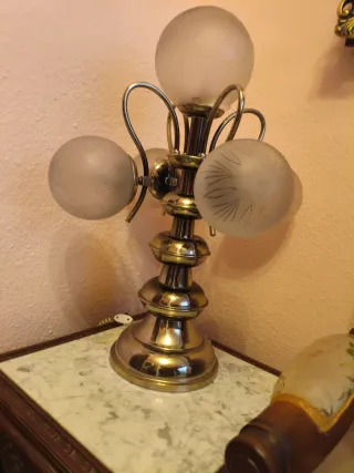 Elegante lámpara de mesa con un diseño vintage y un globo de cristal. Funciona perfectamente. - Base de marmol - Cuerpo metálico con detalles. - Casquillo fino.