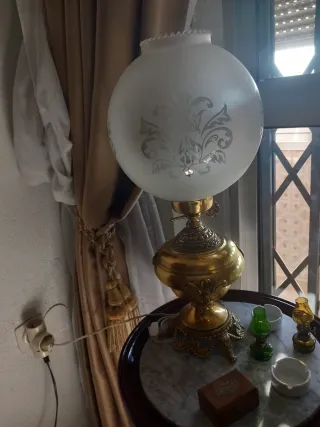 Elegante lámpara de mesa tipo quinqué, perfecta para añadir un toque de distinción a cualquier estancia. Se encuentra en buen estado. - Base y detalles metálicos dorados. - Tulipa de cristal esmerilado con motivos florales. - Diseño clásico y atemporal.