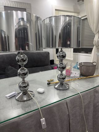 Elegante juego de dos lámparas de mesa, con un diseño moderno. - Base con acabado metálico brillante. - Pantallas de tela en tono gris. - Base con forma geométrica facetada. Una de ella tiene un pequeño arañazo que apenas se nota, ya venía cuando las compré (ver última imagen), por lo demás en perfecto estado. Medidas: 46,5cm x 25cm.