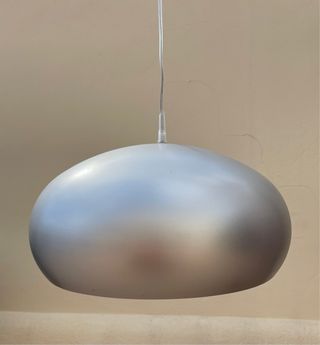 Tipo: Lámpara de techo o colgante. Diseño: Cúpula metálica de color plateado. Uso: Ideal para iluminación funcional sobre mesas o en espacios generales.