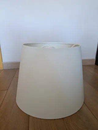 Pantalla para lámpara de Ikea. Viene con la montura para colgarla del techo, pero también se puede utilizar con un pie de base. Diámetro de la parte más grande, 42cm y altura, 32cm. Nueva, tan sólo ha estado puesta un par de meses porque compramos un ventilador de techo. Color crema. Precio original 22€
