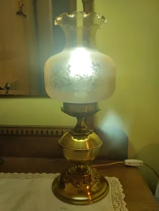 Conjunto de dos lámparas de mesa de estilo antiguo. Aportan un toque clásico y elegante a cualquier espacio. - Base y detalles metálicos en tono dorado. - Pantallas de cristal blanco con diseño. - Altura aproximada de la lámpara más grande: 50 cm. - Altura aproximada de la lámpara más pequeña: 35 cm. -Para más información preguntar sin compromiso,ver fotos,no se envían ya que son frágiles,se venden las 3 juntas,se puede recoger en persona o dicho domicilio
