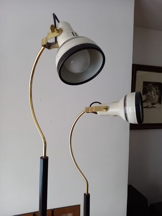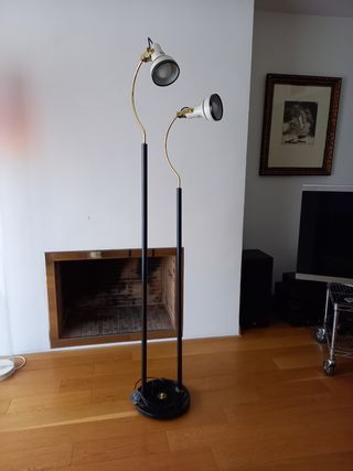 Lampara de pie de dos focos. Color negro y dorado. Cada foco se puede mover y encender de manera independiente. Vintage de los años 70/80. En muy buen estado. Disponible en Elbom Vintage, tienda de muebles y objetos de decoración vintage. Estamos en Calle Escola Pia número 61, en el centro de Sabadell.