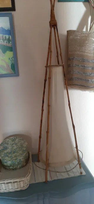 Lámpara de pie con un diseño inspirado en tipis. - Estructura de bambú. - Pantalla de lino. -Hay que poner la instalación eléctrica.