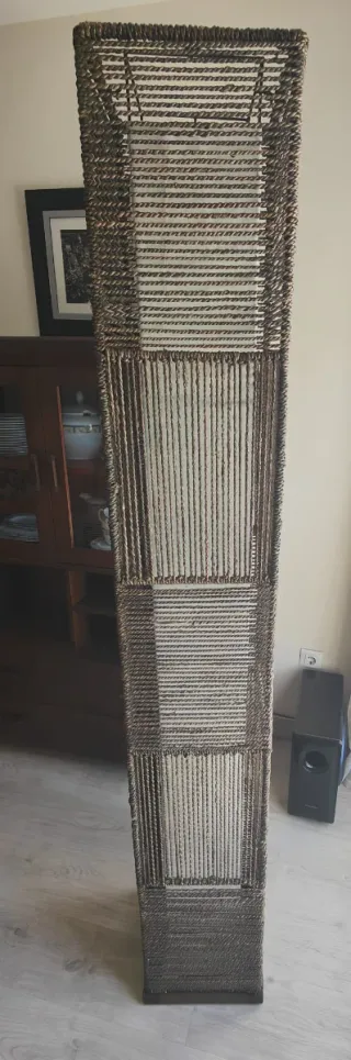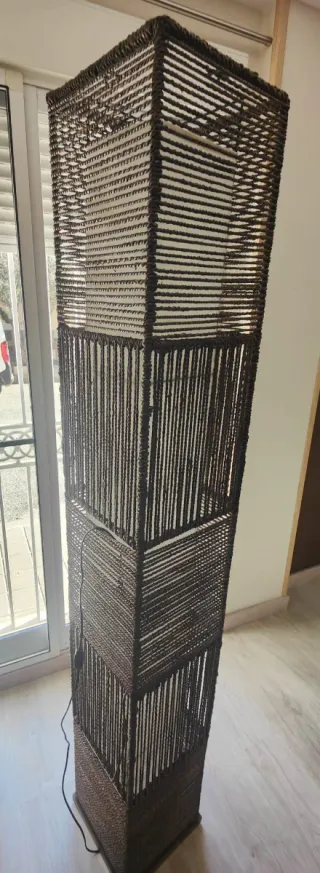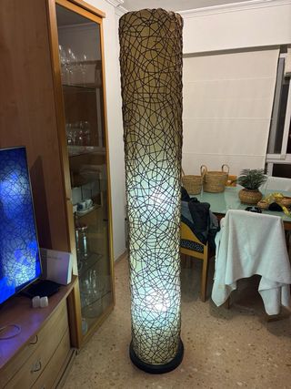 Elegante lámpara de pie con un diseño cilíndrico. - Estructura exterior tejida con fibras naturales. - Pantalla interior de papel que difunde la luz. - Base estable para colocar en cualquier rincón.