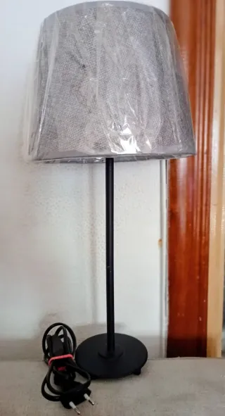 Elegante lámpara de mesa con un diseño moderno y llamativo. Perfecta para añadir un toque de estilo a cualquier habitación. - Pantalla de tela con estampado. - Base y pie de metal. - Cable con interruptor.