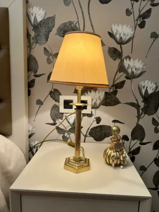 Lámparas de mesilla con un diseño clásico. Dos unidades. - Base y pie de metal dorado. - Pantalla de tela con estampado. - Ideal para dormitorios o salones. Se venden con las bombillas. Se pueden vender por separado. Sería 18 euros una sola lámpara.