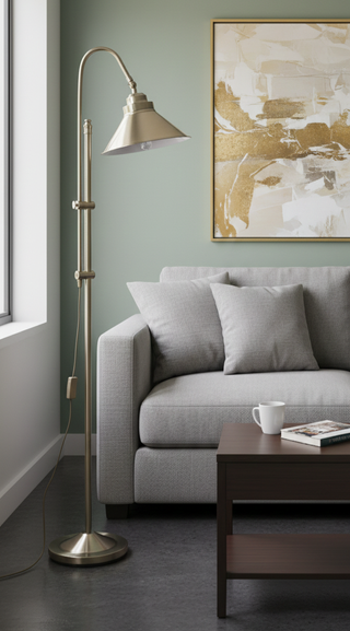 Lámpara de pie con un diseño moderno y elegante. - Acabado metálico. - Brazo articulado para dirigir la luz. - Base estable.