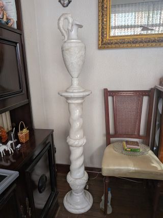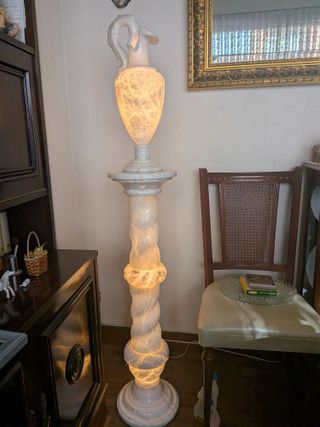 Elegante lámpara de pie con base y columna de alabastro. - Diseño clásico con detalles tallados. - Iluminación cálida y difusa. - Material: Alabastro.