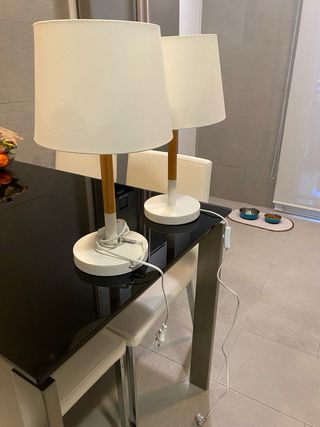 Set de dos lámparas de mesa de Zara Home con pantalla beige. - Base y pie de lámpara en color blanco. - Pantalla de tela. - Diseño clásico y elegante. - Bombillas incluidas - las medidas son de la tulipa para saber cuánto ocupan.