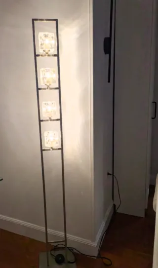 Elegante lámpara de pie con un diseño vertical y estilizado. - Estructura principal en metal. - Cuatro puntos de luz con pantallas de cristal. - Base cuadrada metálica.