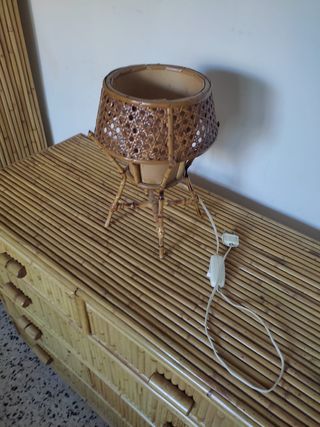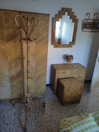 Conjunto de muebles vintage para habitación, elaborados con bambú. Estilo italiano años 70 de Vivai del Sud. Armario, comoda, mesita de noche, 2 cabeceros para cama de 90cm, perchero de pie, lampara pequeña, perchero de pared. - Diseño único con acabado natural. - Piezas que aportan calidez y estilo. - Ideal para crear un ambiente acogedor. Gran oportunidad de conseguir un lote único. En 1stdibs.com solo la cómoda se vende por 1966€ y con una estimación de precio de más de 2.400€.