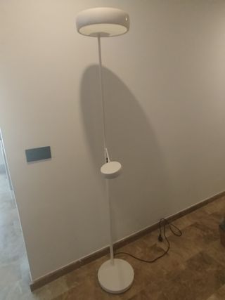 Preciosa lámpara de pie de metal y plástico, en color blanco. Tiene dos luces, una de ambiente y otra más focalizada. La luz les no funciona se puede comprar un LED O eliminar brazo va atornillado - Diseño elegante y moderno. - Dos luces regulables. - Base estable y resistente.