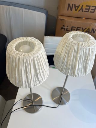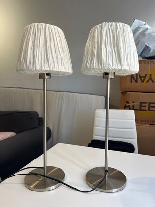 Se venden dos lámparas de mesitas de noche de Ikea. Están prácticamente nuevas. Se venden con bombillas incluidas. - Pantalla de tela en tono beige. - Base y pie de metal plateado.