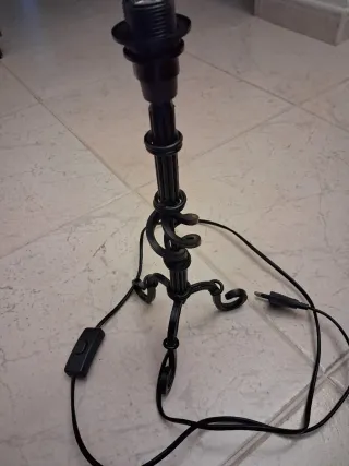 Pie de lámpara con un diseño elegante en forja. Medidas: 36 cms. Alto y 14 cms. Diametro base - Base con tres patas. - Estructura decorativa. - Portalámparas para bombilla con rosca para pantalla. - Interruptor en el cable.