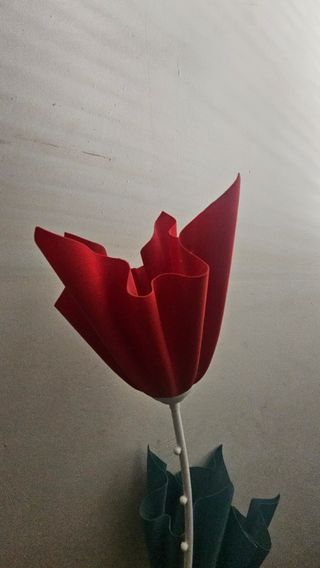 Preciosa lámpara de pie con forma de tulipán. Es de color rojo intenso y tiene un diseño elegante y moderno. La base es de color verde oscuro. - Diseño original y único. - Material de alta calidad. - Perfecta para cualquier habitación.