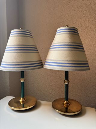 Elegante juego de dos lámparas de mesa con un diseño clásico y atractivo. - Pantallas de tela con rayas azules y grises. - Bases y soportes metálicos en tono dorado y verde. - Adornos dorados en el pie de cada lámpara.