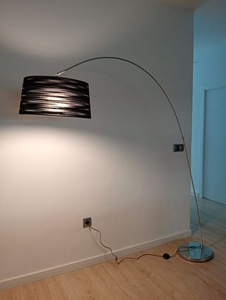 Preciosa lámpara de pie estilo arco, ideal para dar un toque moderno a tu salón. Se encuentra en perfecto estado. Para salón, habitación o donde quieras dar un punto de luz superior sin que tengas que hacer instalación en el techo. - Pantalla de tela de color negro con detalles translúcidos. 45 cm diámetro. - Base y arco metálicos de color plata. 190 cm altura total. 170 cm ancho total. - Diseño elegante y curvado.