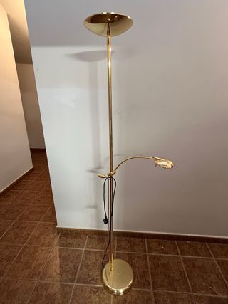 Elegante lámpara de pie con un acabado metálico dorado. Su diseño combina un foco principal en la parte superior con un brazo articulado para una luz adicional. - Base redonda y estable. - Brazo flexible para direccionar la luz. - Cable de alimentación incluido.