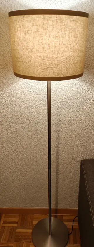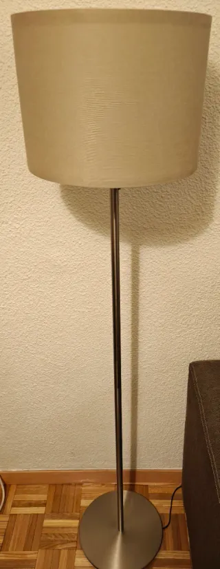 Elegante lámpara de pie de Ikea. Su diseño moderno y materiales de calidad la hacen ideal para cualquier rincón. - Pantalla de tela en tono beige. - Base y pie de metal en acabado plateado.