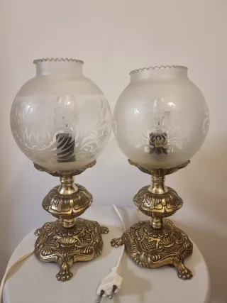 Elegante pareja de lámparas de mesa con un diseño clásico y detallado. Perfectas para añadir un toque de distinción a cualquier mesita de noche o rincón. - Base y estructura en metal con acabado dorado. - Pantallas de cristal esmerilado con grabado floral. - Diseño ornamental en la base y el pie.