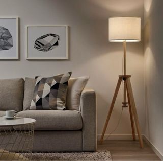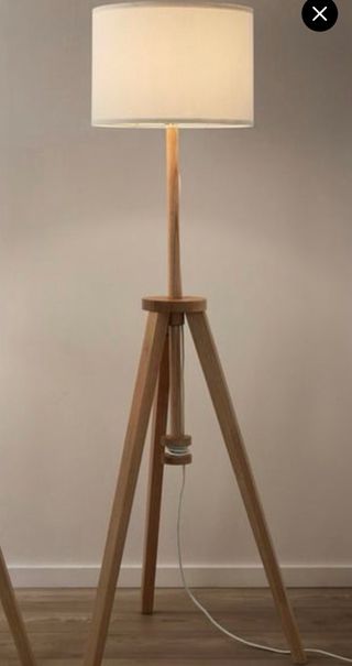 Lámpara de pie con un diseño moderno y elegante, perfecta para cualquier rincón de tu hogar. Su estructura de madera le da un toque cálido y natural. - Base de trípode estable. - Pantalla cilíndrica de tela.