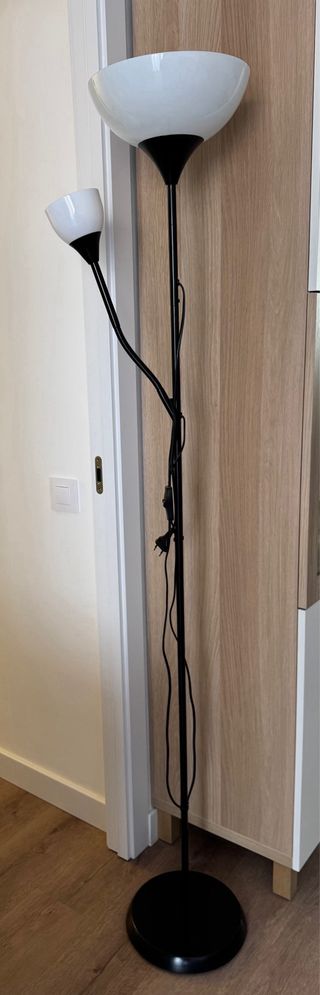 Elegante lámpara de pie con un diseño moderno y sofisticado. Perfecta para añadir un toque de estilo a cualquier rincón de tu hogar. - Acabado en negro con detalles dorados. - Fabricada con materiales resistentes. - 10€ cada una. - Precio negociable.