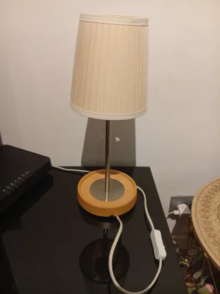 Elegante lámpara de pie de Ikea con un diseño moderno y funcional. Combina a la perfección con cualquier estilo de decoración. - Pantalla de tela en color beige. - Base y estructura de metal en color negro. - Interruptor de pie para encendido y apagado.