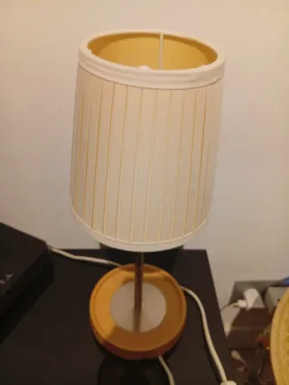 Elegante lámpara de mesa con un diseño moderno y materiales de calidad. - Pantalla de tela plisada. - Base circular de madera. - Pie metálico, mide 40cm