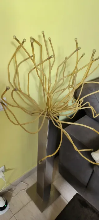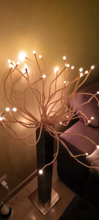 Lámpara de pie con un diseño moderno y original que imita ramas. - Base cuadrada de metal. - Estructura de madera con luces LED integradas. - Color plata, es inox, dispongo de 2 un, una de bombillas fijas y otra de rosca, 30€ la un.