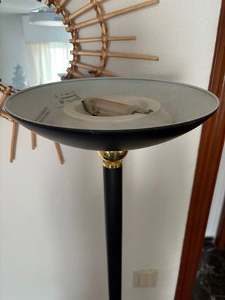 Preciosa lampara de pie de metal, en color dorado. Tiene dos luces, una superior y otra lateral. Se encuentra en buen estado. - Diseño elegante y atemporal. - Perfecta para iluminar cualquier rincón de tu hogar. - Dos luces regulables. ⚠️ El tubo de bombilla principal está fundido La base tiene pequeñas imperfecciones que no se pueden limpiar