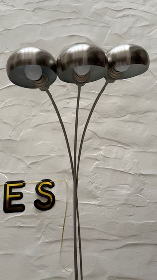 Elegante lámpara de pie con un diseño moderno y sofisticado. - Tres brazos curvos. - Acabado en metal. - Base redonda: 45 cm - Altura total 200 cm Tiene uno de los brazos despegado de la base.