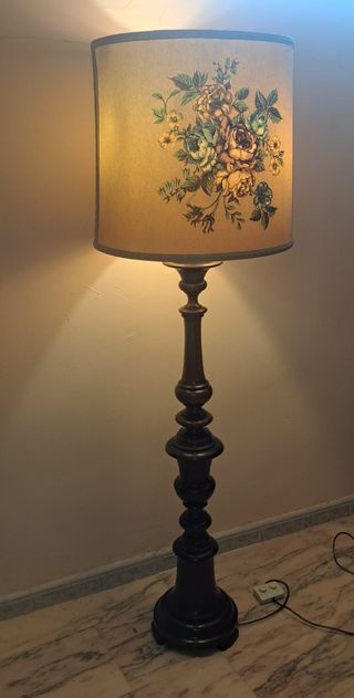 De madera y tallada artesanalmente con motivos vegetales representado racimos de uvas y hojas de vid.Lleva una pantalla también antigua en raso beige con algunas manchas lógicas por los años que tiene.Funciona perfectamente con un cordón que lleva el mismo portabombillas. La lámpara con pantalla tiene una altura de 160cm....sin ella tiene 140cm... posibilidad de porte o de recoger en nuestra tienda en Colmenar de Oreja.