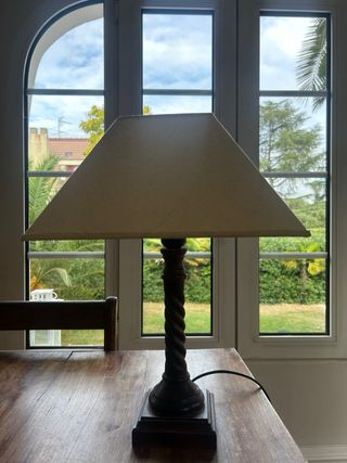 Elegante lámpara de mesa con un diseño clásico. - Base y pie de madera con un acabado en espiral. - Pantalla de tela en forma trapezoidal. Tengo 2 unidades