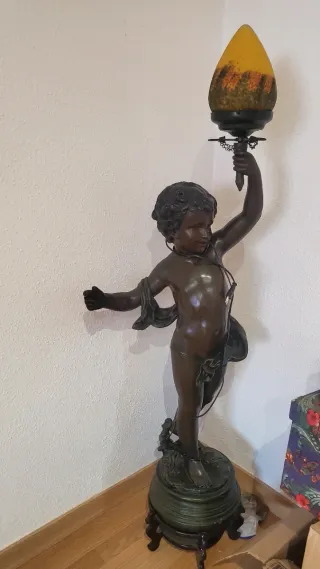 Elegante lámpara de pie con figura de niño portando una antorcha. La pantalla tiene un diseño degradado en tonos amarillos y anaranjados. - Base de madera figura de escayola. - Pantalla de cristal con detalles decorativos.