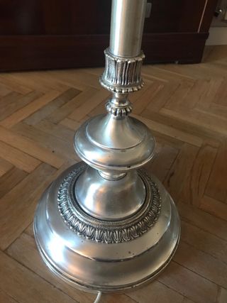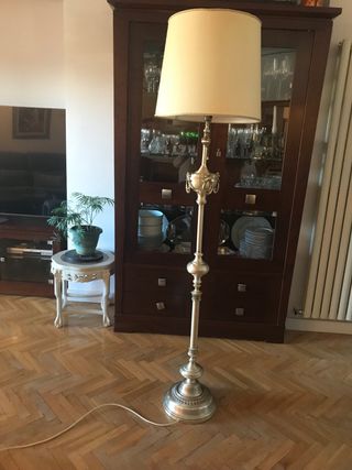 Lampara de pie como nueva en color plara con un toque de envejecido y pantalla incluida . medidas : altura contando la pantalla 1,78 cm y 0,43 diametro de la pantalla