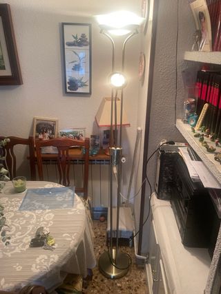 Elegante lámpara de pie con un diseño moderno y funcional. Combina acabados metálicos con detalles en cristal para un toque sofisticado. - Altura ajustable. - Luz auxiliar orientable. - Base estable. La luz superior no funciona y el cristal está roto por un lado. Perfecta para reparar o piezas. Nuevas rondan más de 100 euros.