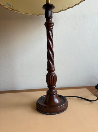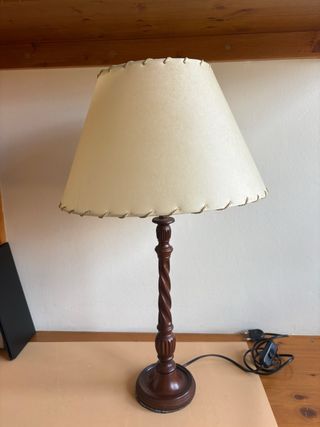 Elegante lámpara de sobremesa, ideal para cualquier espacio. Se encuentra en excelentes condiciones. REGALO la pantalla porque tiene algún pequeño desperfecto propio del paso del tiempo. Se puede usar si no se quiere cambiar. - Pantalla de tela de color crema - Base de metal y pie de madera oscura y detalles metálicos plateados. - Estilo moderno y sofisticado. - Perfecta para una mesita de noche o escritorio. Las medidas del pie son 13x13x28,5 La altura con la pantalla es 38 cm