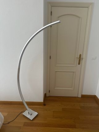Elegante lámpara de pie con un diseño curvo y moderno, perfecta para iluminar tu salón o cualquier otra estancia, perfecta para lectura. - Acabado en metal plateado. - Luz LED integrada. la base tiene un golpe, pero al colocarla junto al sofá u otra butaca no se ve. Las medidas son aproximadas.
