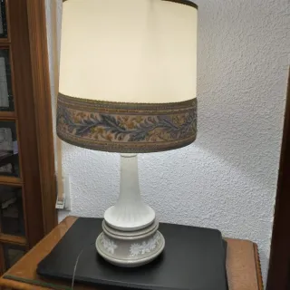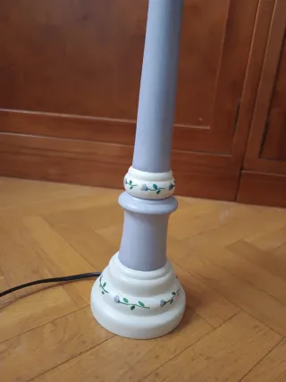Elegante lámpara de mesa con un diseño clásico. - Pantalla de tela morada. - Base y pie de madera blanco con detalles decorativos. - Cable de alimentación incluido. - Con bombilla incluida. - Se puede negociar el precio. - Se entrega en Majadahonda por la rotonda de la fuente de los jardinillos o por la estación.