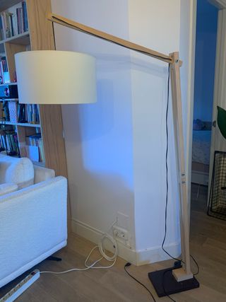 Lámpara de pie con un diseño moderno y elegante, inspirada en el estilo nórdico. Su estructura de madera aporta calidez y un toque natural a cualquier espacio. - Base de madera. - Pantalla de tela. - Brazo ajustable. - Incluye bombilla grande transparente estilo vintage En la pantalla se puede apreciar algún golpe tras la mudanza