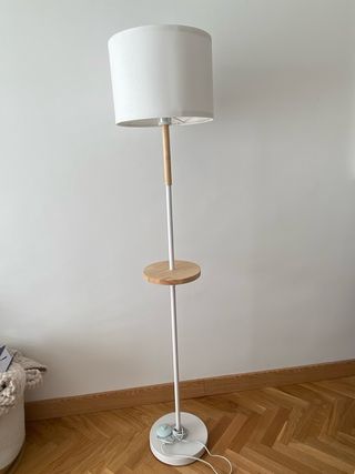 Lámpara de pie con un diseño moderno y funcional. Perfecta para añadir un toque de estilo a cualquier habitación. Acabados blanco y madera clara. - Pantalla de tela blanca. Diámetro 33 cm - Base y poste de metal con pulsador de pie - Incluye un apoyo auxiliar de madera. - Altura standard 1.55 m -Incluye bombilla de luz calida