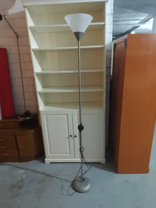 Lámpara de pie de Ikea con un diseño moderno. - Base redonda y estable. - Poste alto y delgado. - Pantalla en forma de cuenco.