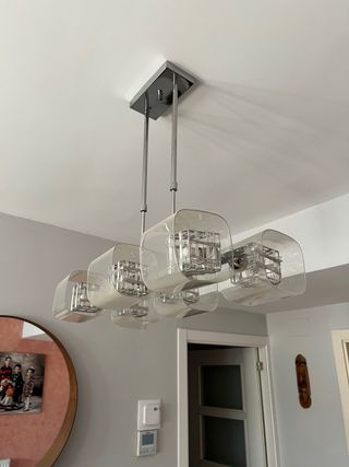Elegante lámparas de salón con un diseño moderno y acabados metálicos. - lampara de pie con Estructura principal en metal. Diferentes tonos de iluminacion, bombilla led, Detalle superior en acabado blanco. (Nuevo 99€) - lampara colgante salon con 6 bombillas led, estructura metalica con acabado en vidrio (nuevo 349€) - plafon con 4 bombillas led, estructura metalica con acabado en vidrio (nuevo 289€)