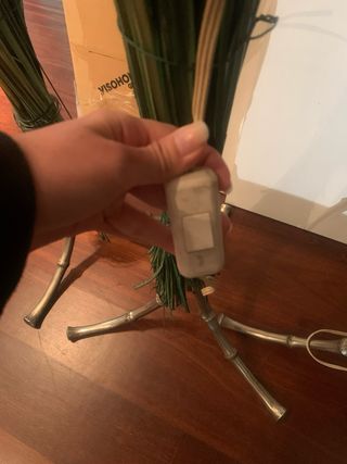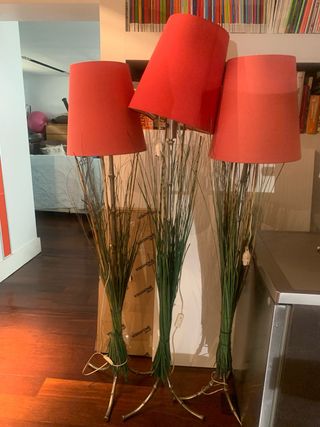 Vendo 3 lámparas de pie originales de metal con estructura de ramas y pantalla roja. Es posible retirar la parte verde si se desea. Funcionan perfectamente. Cada una incluye interruptor de encendido/apagado y enchufe. Altura aproximada: 160 cm.