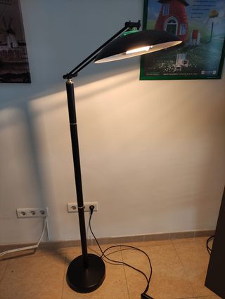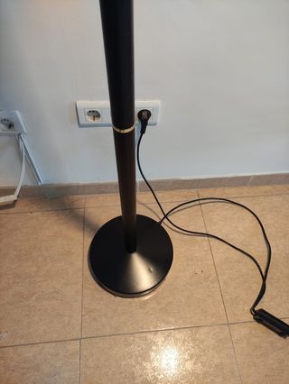 Preciosa lámpara de pie en color negro con detalles dorados. Se encuentra en muy buen estado. - Diseño elegante y moderno. - Altura regulable. - Perfecta para iluminar cualquier rincón de tu hogar.