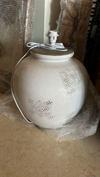 bonito pie de lampara de ceramica de la prestigiosa firma Brucs, en color blanco esmaltado con acabado envejecido. 41 cm de diametrox 50 cm (hasta punto de bombilla, pero son 41 cm aprox el diametro de la base). Pvp 295€