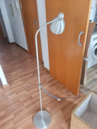 Lámpara de pie con un diseño moderno y funcional, perfecta para cualquier rincón de tu hogar. Su acabado metálico le da un toque elegante. - Base redonda y estable. - Brazo flexible para dirigir la luz. - Interruptor en el cable. - En el pie tiene alguna ralladita.